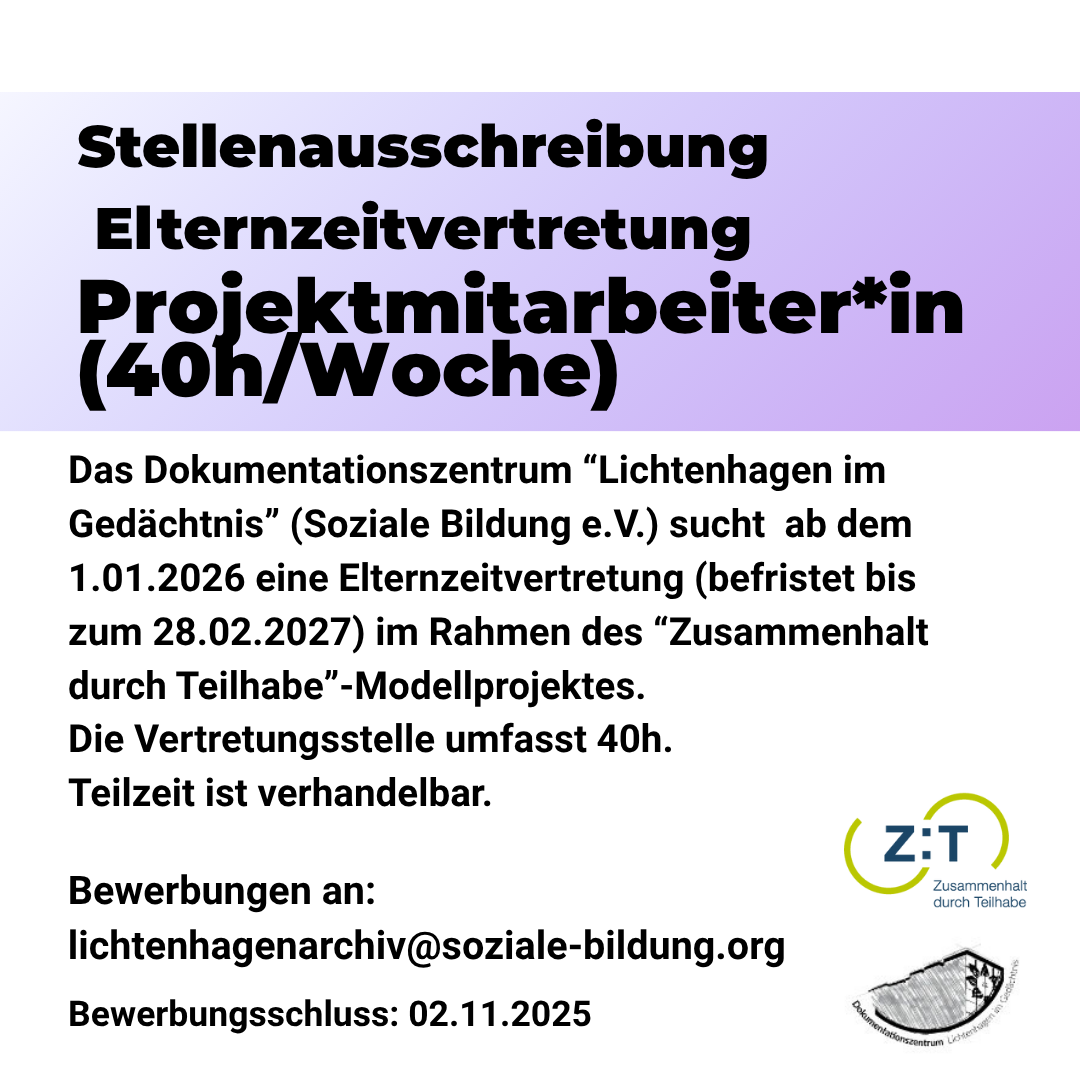 Soziale Bildung e.V. sucht in Rostock ab dem 1. Januar 2026 eine*n Projektmitarbeiter*in imDokumentationszentrum „Lichtenhagen im Gedächtnis“ als Elternzeitvertretung befristet voraussichtlich bis zum 28. Februar 2027.